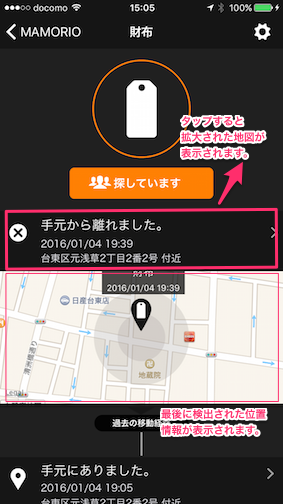 他のMAMORIOユーザーが、自分の紛失したMAMORIOの近くにいた場合、その場所をお知らせしてるようです。 - 安心サポート