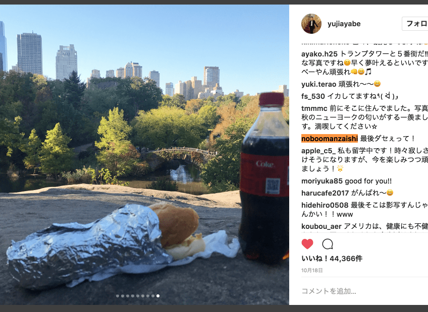 やっとニューヨークへと旅立ったピース綾部(@yujiayabe)さんが始めたインスタグラム。